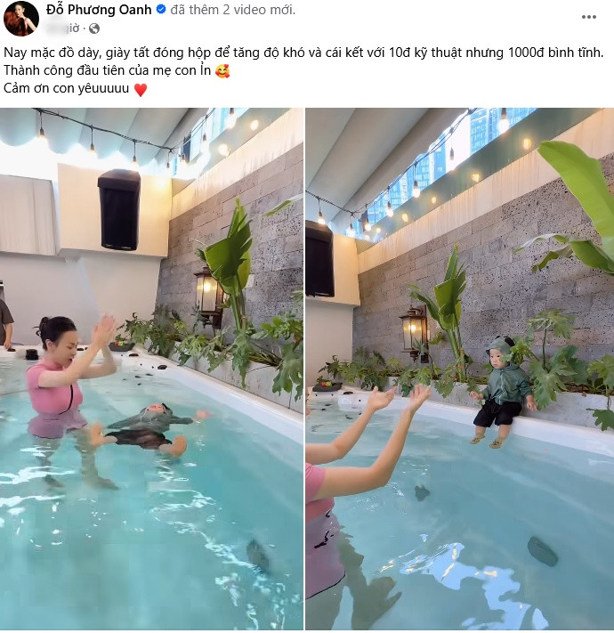 Mới đây, Phương Oanh chia sẻ clip cho bé trai Jimmy tự bơi sinh tồn một cách điêu luyện gây chú ý. Người đẹp chia sẻ: “Nay mặc đồ dày, giày tất đóng hộp để tăng độ khó và cái kết với 10 điểm kỹ thuật nhưng 1000 điểm bình tĩnh. Thành công đầu tiên của mẹ con Ỉn.”